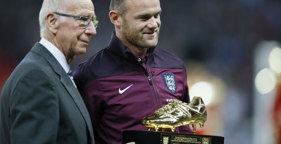 PHOTO: Sir Bobby Charlton presents @WayneRooney with his golden boot #Rooney50 #ENGvEST pic.twitter.com/brMp8Ti7J4