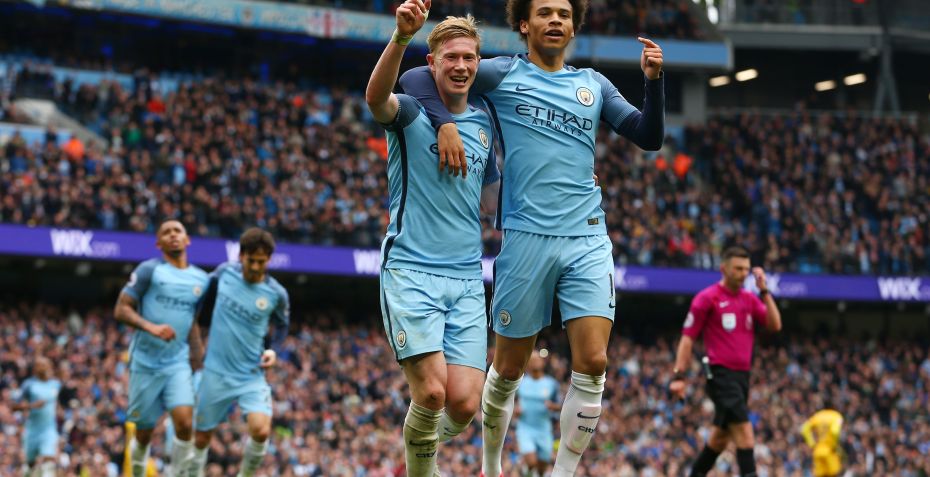 De Bruyne har fem mål og 15 assists for City i Premier League. Sterling og Sané har scoret henholdsvis syv og fem mål.