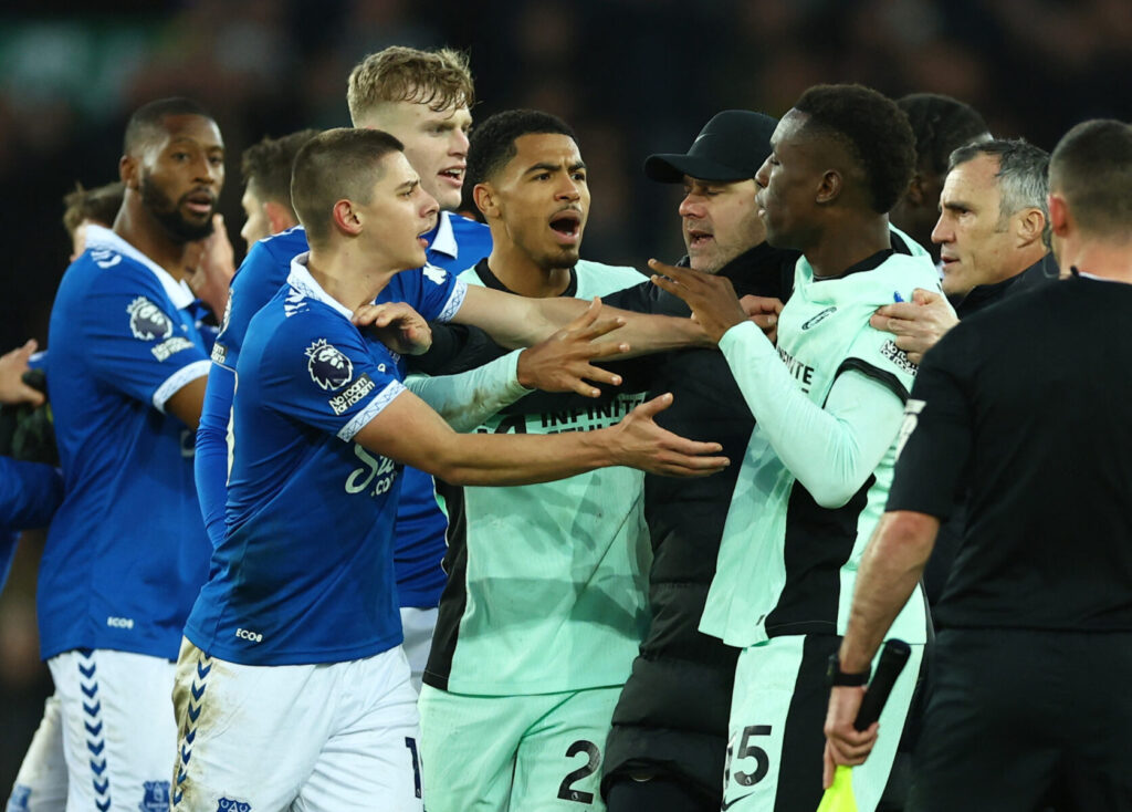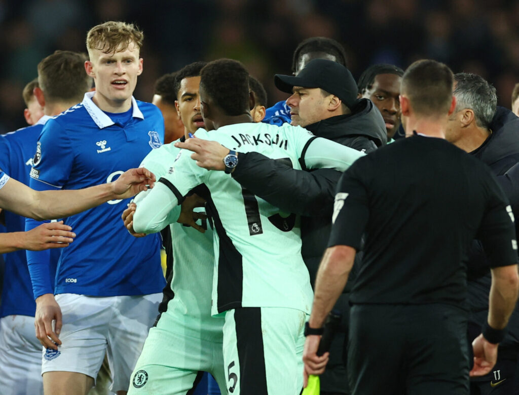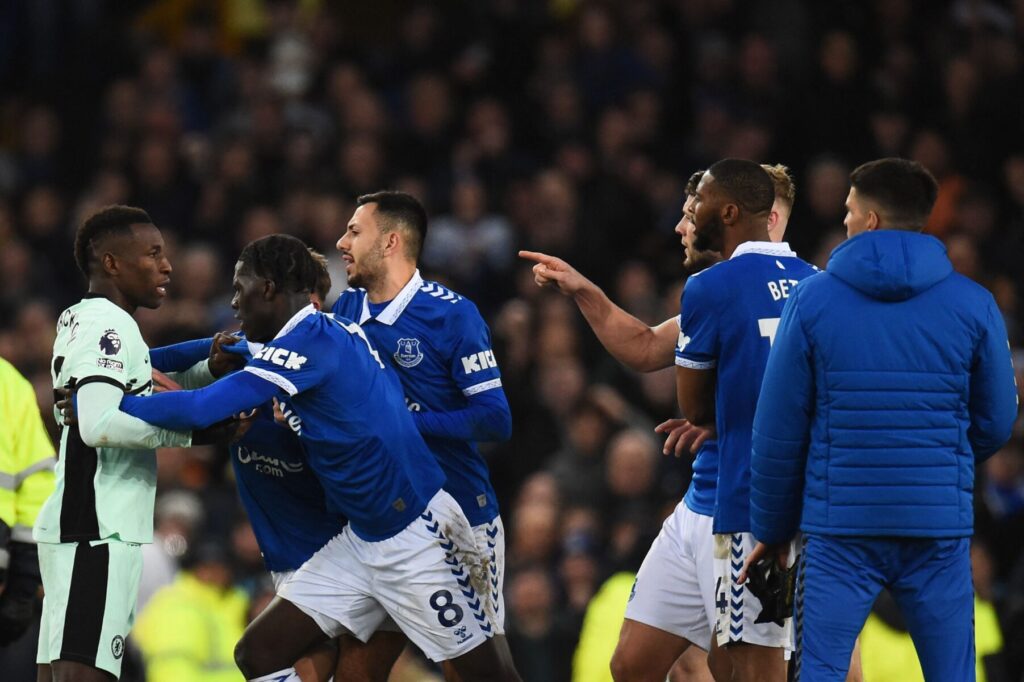 Nicolas Jackson kom i klammeri med Evertons Nathan Patterson, hvor billederne viser, at Chelsea-angriberen tager kvælertag på Everton-backen.