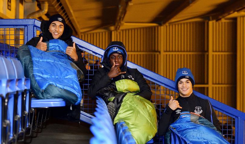Evertons u-23 hold har sovet på Evertons stadion, Goodison Park, for at tjene penge til at donere til hjemløse i Liverpool.