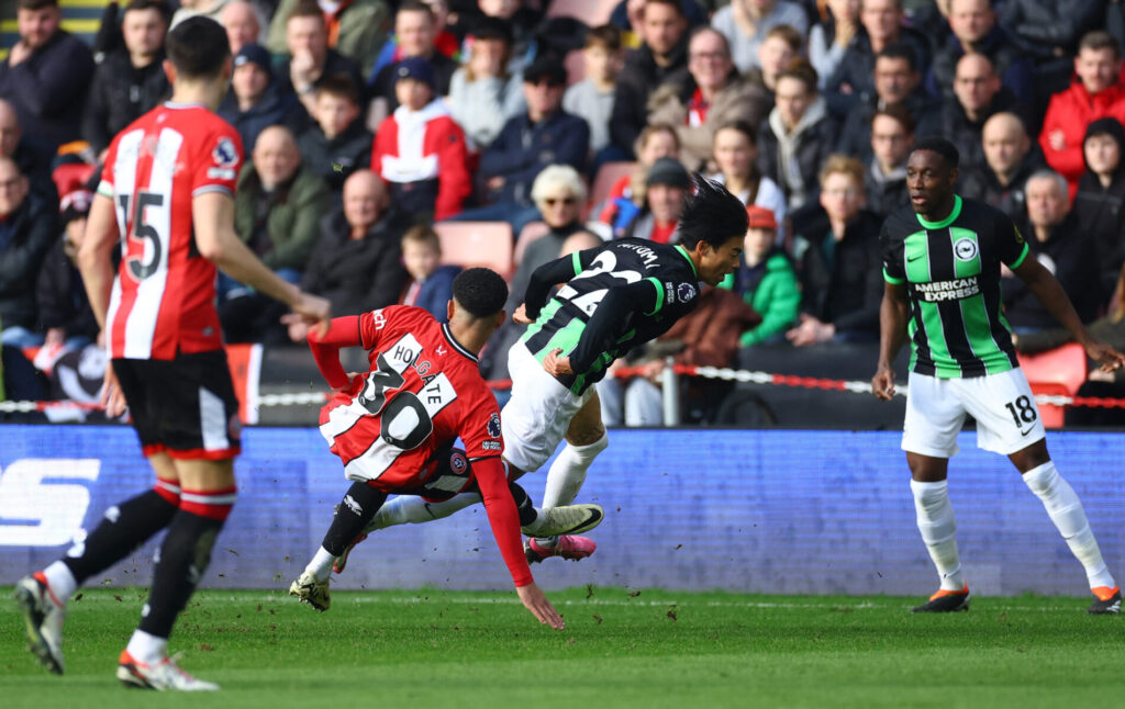 I videoen øverst i artiklen kan du se Holgates tackling på Mitoma.