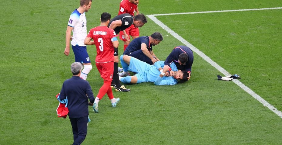 Der var mange tillægsminutter i kampen mellem England og Iran mandag, og det skyldes, at iranernes målmand, Alireza Beiranvand, måtte modtage behandling i mange minutter som følge af en voldsom duel med sin egen medspiller.