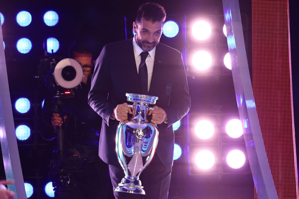 Gianluigi Buffon er kommet på scenen med EM-pokalen. Italien vandt det seneste EM, hvor de slog England i en dramatisk finale, som blev afgjort efter straffesparkskonkurrence.
