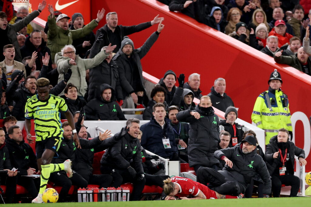I en duel på sidelinjen gav Bukayo Saka et solidt skulderskub til Kostas Tsimikas, og det endte rigtig galt for Liverpool-spilleren.
