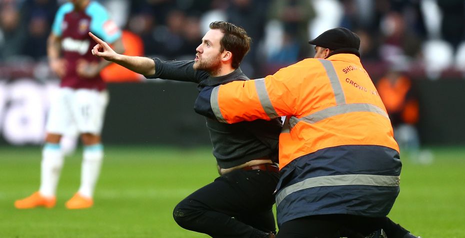 Det hele startede, da en enkelt West Ham-fan invaderede banen og først blev stoppet, da kaptajn Mark Noble nedlagde ham. Det åbnede tydeligvis fansenes øjne for, at sikkerheden på stadionet tydeligvis ikke var optimal.