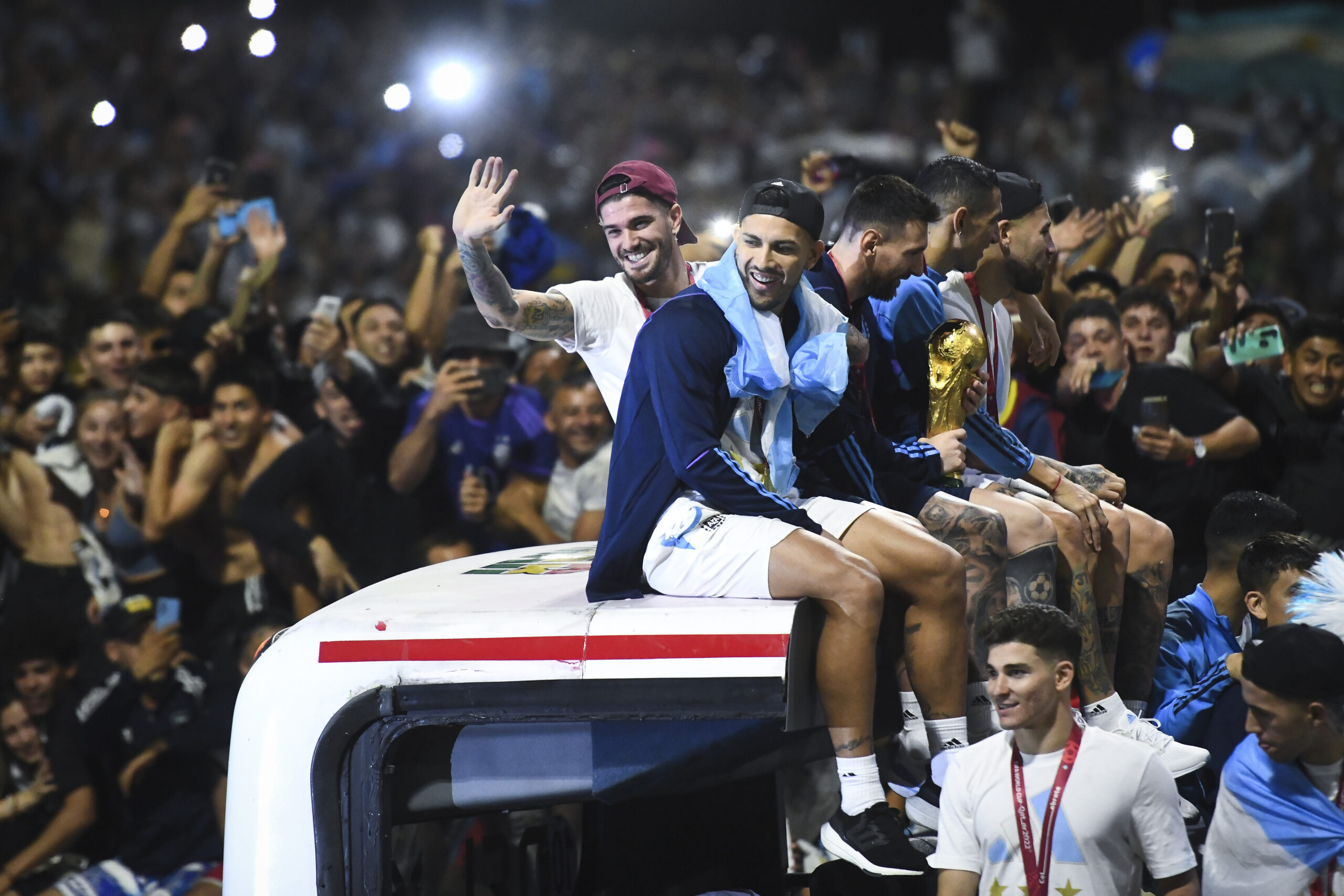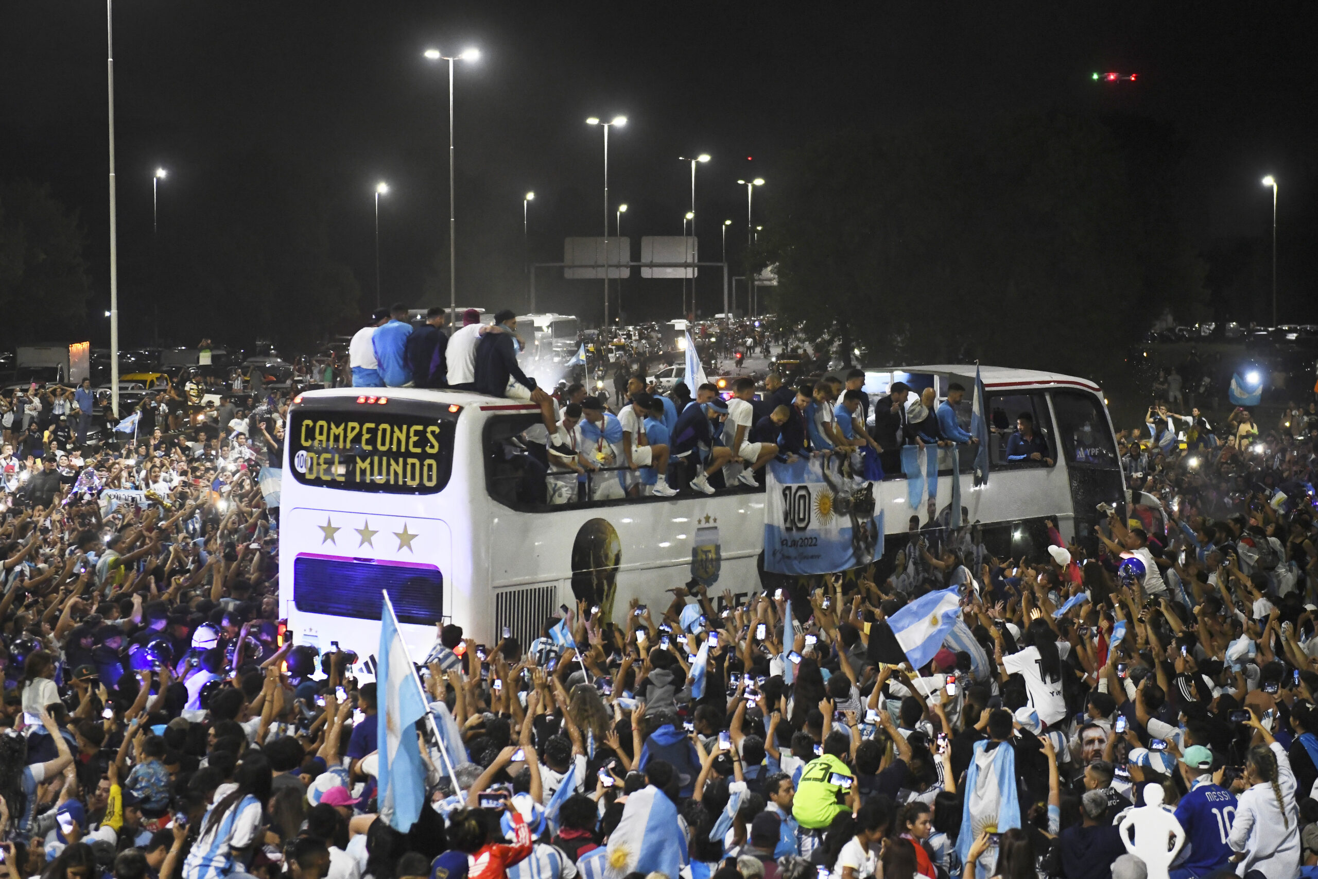 VM-fejringen er i fuld gang, hvor spillerne kører rundt i en åben bus på Buenos Aires' veje og hyldes af millioner af mennesker.