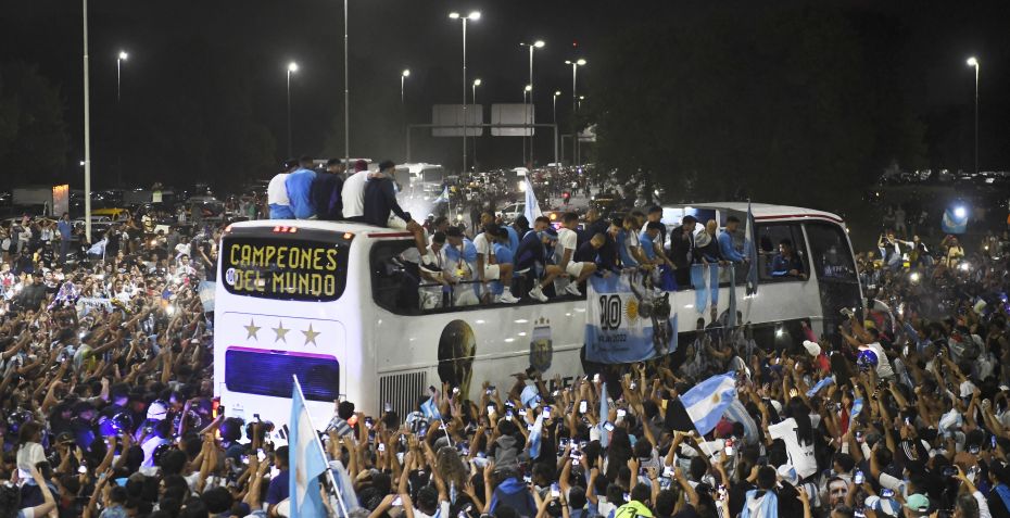 VM-fejringen er i fuld gang, hvor spillerne kører rundt i en åben bus på Buenos Aires' veje og hyldes af millioner af mennesker.