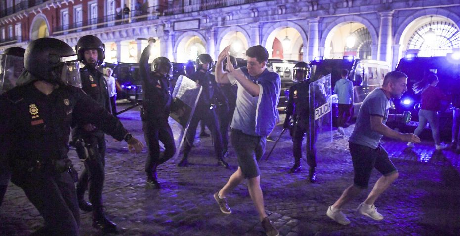 Der opstod optøjer på Plaza Mayor i Madrid inden Champions League-opgøret mellem Atletico Madrid og Leicester i onsdags.